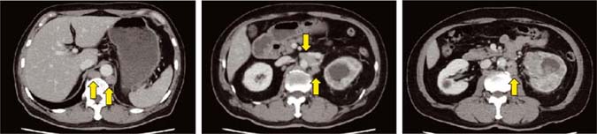 Figure 1: Computed tomography at the first visit. A moderately enhanced mass occupies the left renal pelvis, accompanying hydronephrosis and multiple para-aortic lymphadenopathy (arrows).