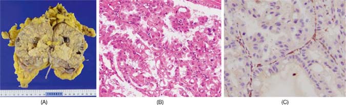 Figure 2: Pathological findings of nephrectomy specimen. Macroscopic findings (A), microscopic findings (B), hematoxylin and eosin stain, ×200), and immunohistochemistry of fumarate hydratase (C, ×200).