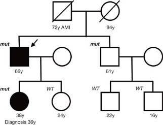 Figure 3: Family pedigree. Ages shown are those at which subjects took genetic testing. An arrow indicates the present case. AMI, acute myocardial infarction; mut, germline mutation of the fumarate hydratase gene; WT, wild type.