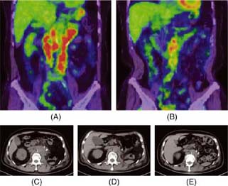 Figure 4: FDG-PET before axitinib (A) and 8 months after nivolumab following 7-months of axitinib (B). Metabolic tumor volume (MTV) was defined as the tumor volume greater than 40% of standardized uptake value (SUV) max. Total lesion glycolysis (TLG) was calculated as MTV×SUVmean. MTV and TLG were calculated by using LIFEx package (www.lifexsoft.org). MTV/TLG are 215.3 cm3/1042.5 g (A) and 15.8 cm3/112.5 g (B). CT before axitinib (C), 6 months after axitinib (D), and 7 months after nivolumab (E).