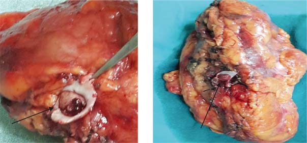 Figure 1: Level 1 thrombus (HPE Squamous cell carcinoma) with arrows showing level 1 thrombus.