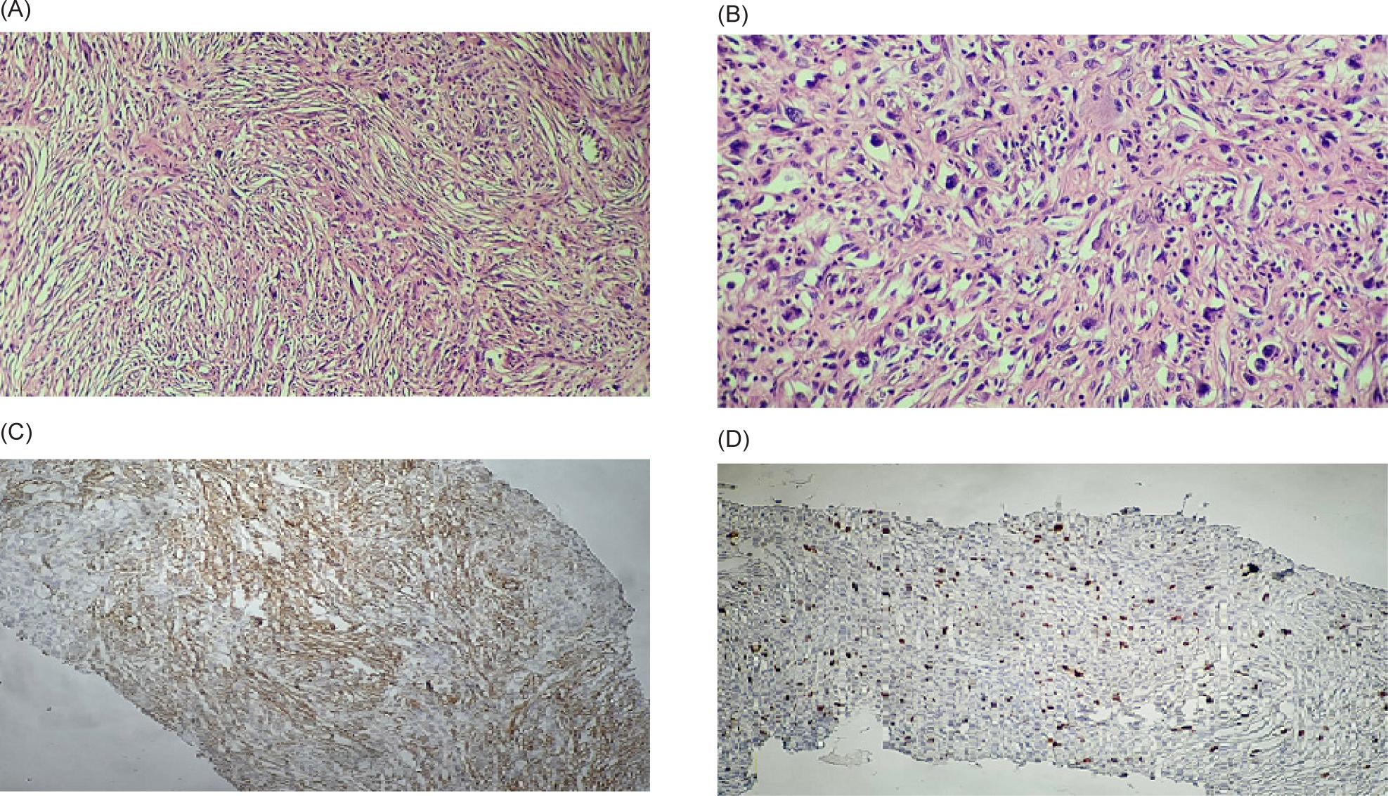 FIGURE 2: (A) Short fascicles of spindled myofibroblastic cells without overt atypia admixed with acute and chronic inflammatory cells (200×). (B) Ganglion-like polygonal cells with large rounded nuclei and prominent nucleoli (400×). Immunohistochemistry (IHC) analyses revealed positive reaction for (C) smooth muscle actin (SMA) and (D) Ki-67 (5%).