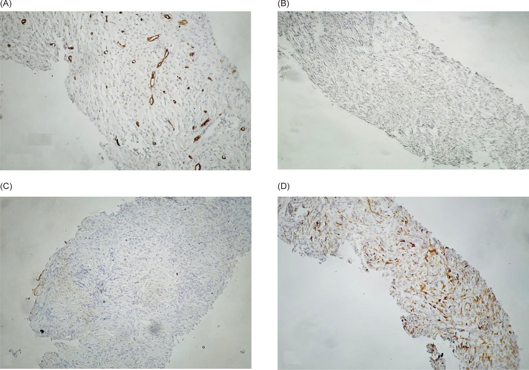 FIGURE 3: Immunohistochemistry (IHC) analyses revealed negative reactions for (A) CD34, (B) Activin receptor-like kinase (ALK), (C) Pan-cytokeratin, and (D) Desmin.