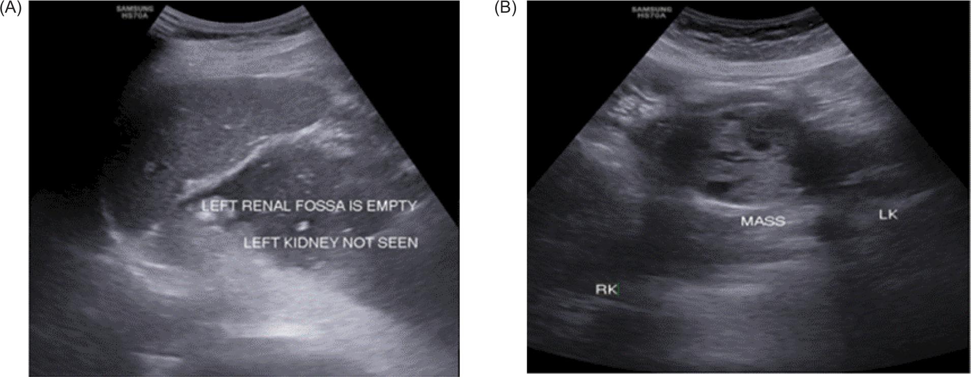 Figure 1: (A) Left kidney not visualized in the left renal fossa; (B) Well-defined solid mass of heterogeneous echotexture arising from isthmus of HSK.