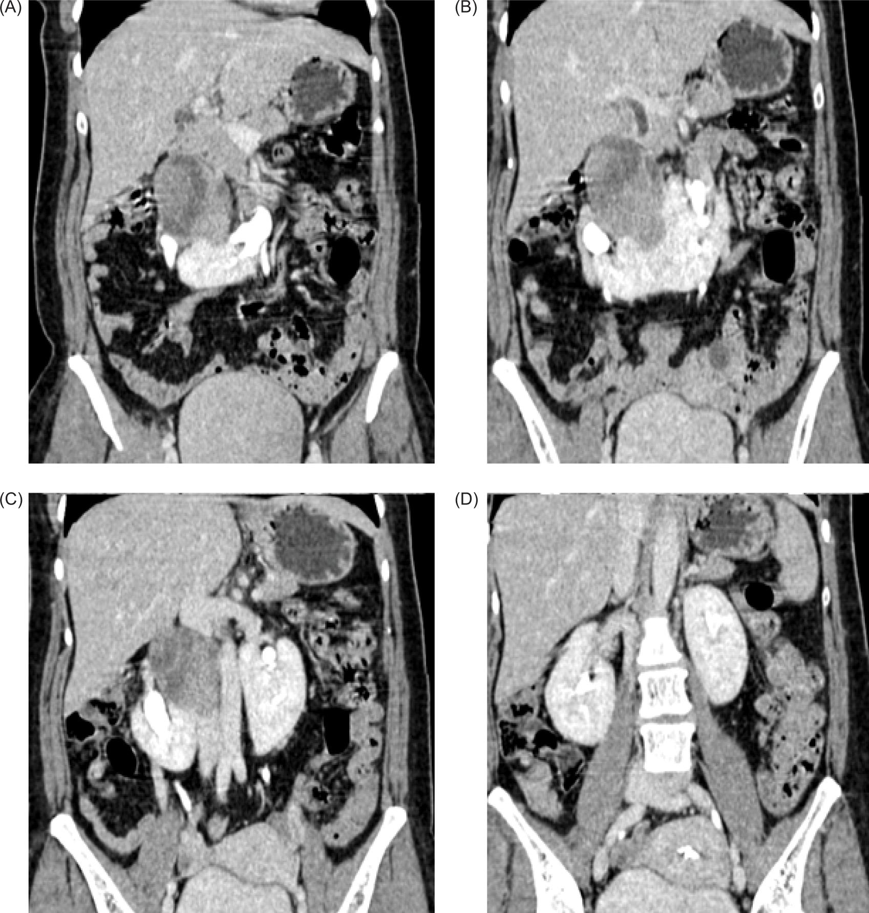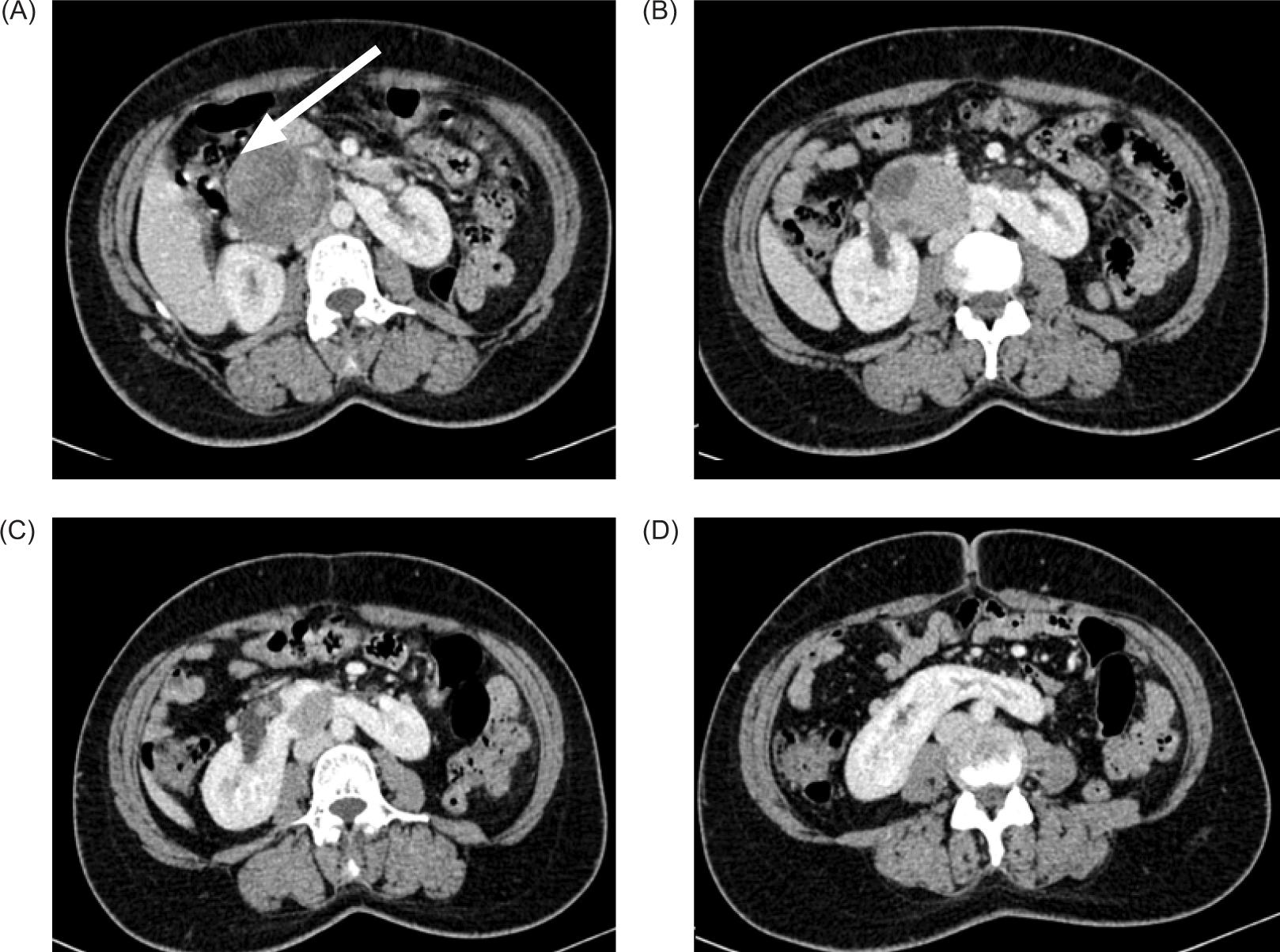 Figure 3: (A–D) Axial contrast enhanced CT abdomen showing well-defined heterogeneously enhancing solid mass arising from isthmus compressing and displacing adjoining second and proximal third portion of the duodenum (arrow in [A]).