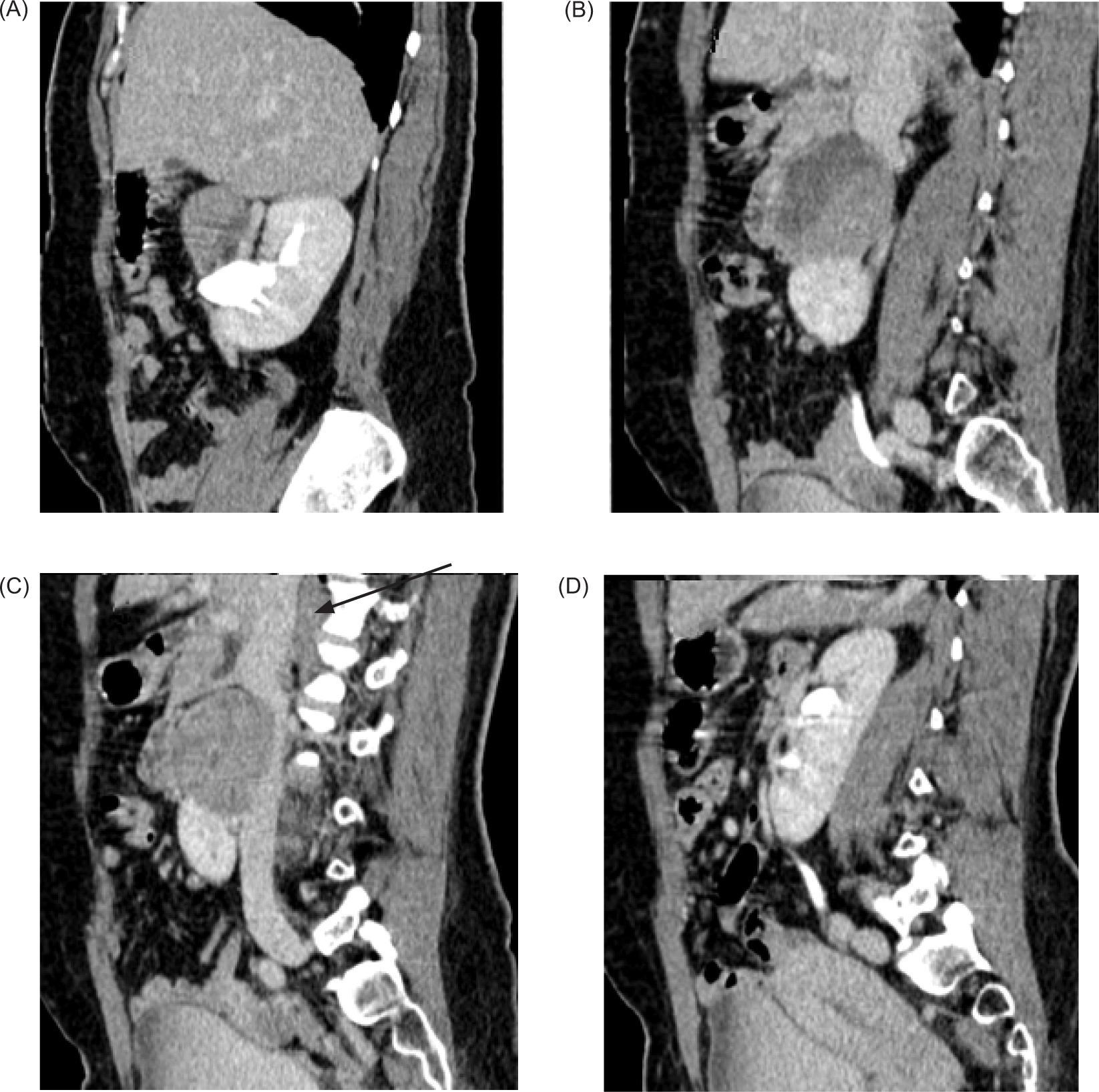 Figure 4: (A–D) Contrast enhanced CT sagittal images—Mass arising from the isthmus, posteriorly compressing the IVC with obliteration of intervening fat planes (arrow).
