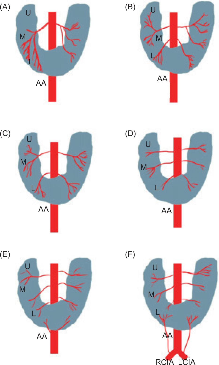 Graves’ classification has six basic patterns of arterial supply for each HSK segment. Each moiety has upper, middle, and lower segments (2, 13). See Figure 6.