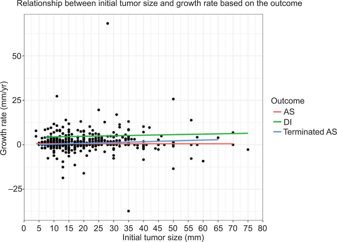 Figure 1: Growth rate as a function of initial tumour size stratified on the three groups. AS = active surveillance; DI = delayed intervention, Terminated AS = patients who terminated AS.