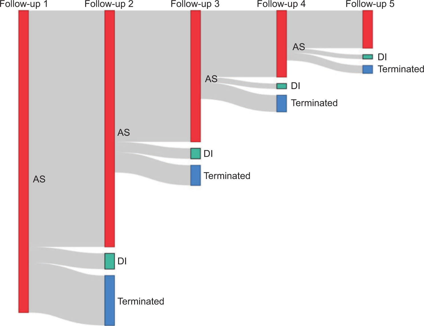 Figure 2: The flow of patients at each follow-up visit. AS = active surveillance; DI = delayed intervention; Terminated = patients who terminated AS.