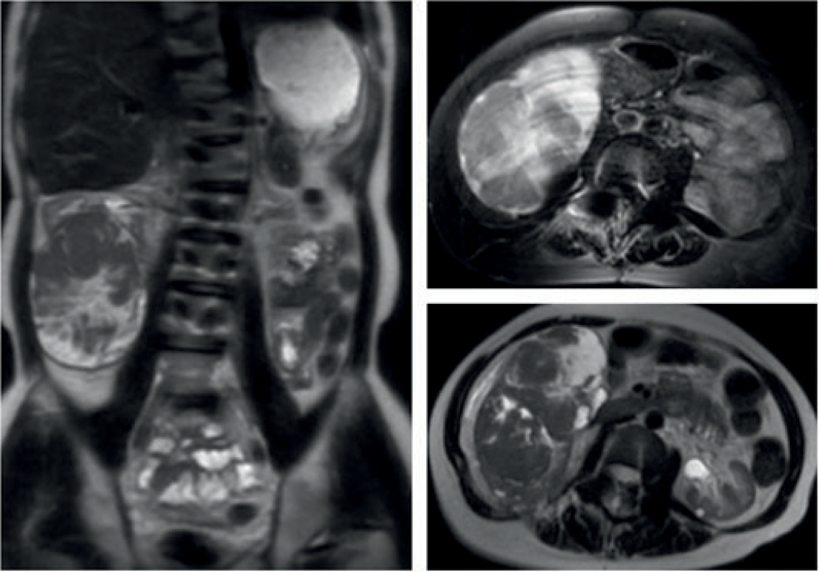 Figure 1: MRI imaging of abdomen without IV contrast: Multiplanar T1- and T2-weighted images of the abdomen were obtained without IV contrast. A large and complex mass is seen arising from the right kidney lower pole measuring 11.6 × 8.3 × 12.7 cm.