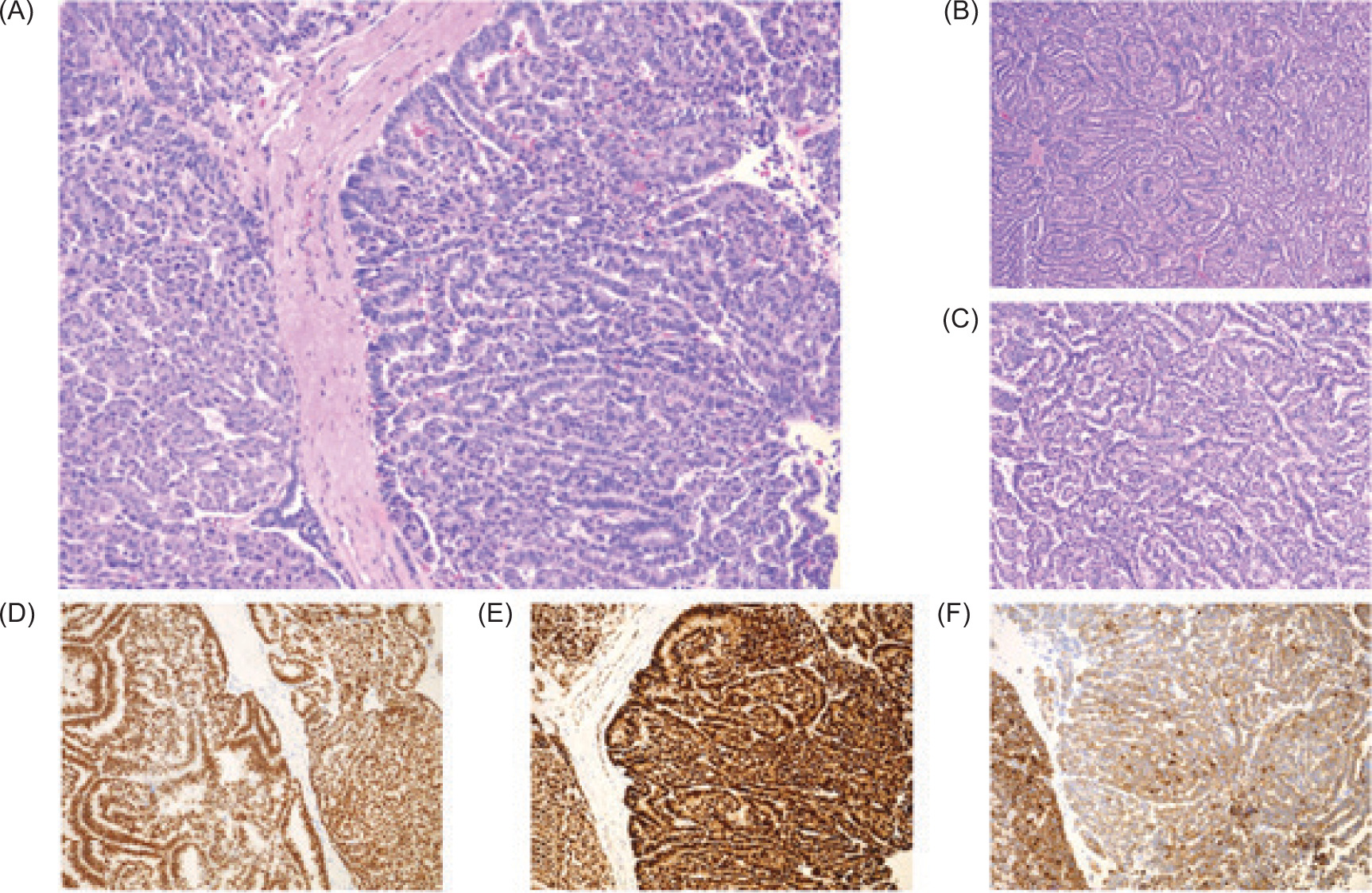 Figure 2: Kidney, right, radical nephrectomy (hematoxylin and eosin [H&E] staining). (A–C) Histologic sections showed variable degrees of epithelial differentiation ranging from more primitive rosette-like structures and cords to well-differentiated mature tubules lined by cuboidal to columnar cells with elongated nuclei; no significant blastemal or stromal component was identified. By immunohistochemistry, tumor cells were positive for (D) WT1 and (E) PAX8 with strong nuclear staining, and variable membranous and cytoplasmic expression of pankeratin I. Additional immunohistochemical staining for BRAF V600E mutation (not pictured) was negative. Overall, the histologic and immunohistochemical features were consistent with epithelial-predominant WT and favorable histology (absent anaplasia). Molecular testing revealed TP53 gene mutation.
