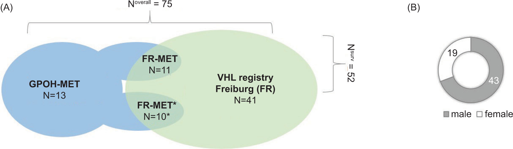 Figure 1: Study population overview: VHL-related PPGL in childhood. (A) Summary of patients in the German Pediatric Oncology and Hematology–Malignant Endocrine Tumor registry in Magdeburg (GPOH-MET) and Freiburg-VHL registry between 1996 and 2022. Inclusion criteria: at least one PPGL manifestation with age <18 years, genetic confirmation of VHL. Overlap of patients, n = 11. Both registries contain clinical and genetic data. Overlap of patients, n = 10. *Genetic data from the Freiburg-VHL registry and clinical data from the GPOH-MET registry without follow-up data. (B) Sex distribution of patients. PPGL: pheochromocytoma and paraganglioma.