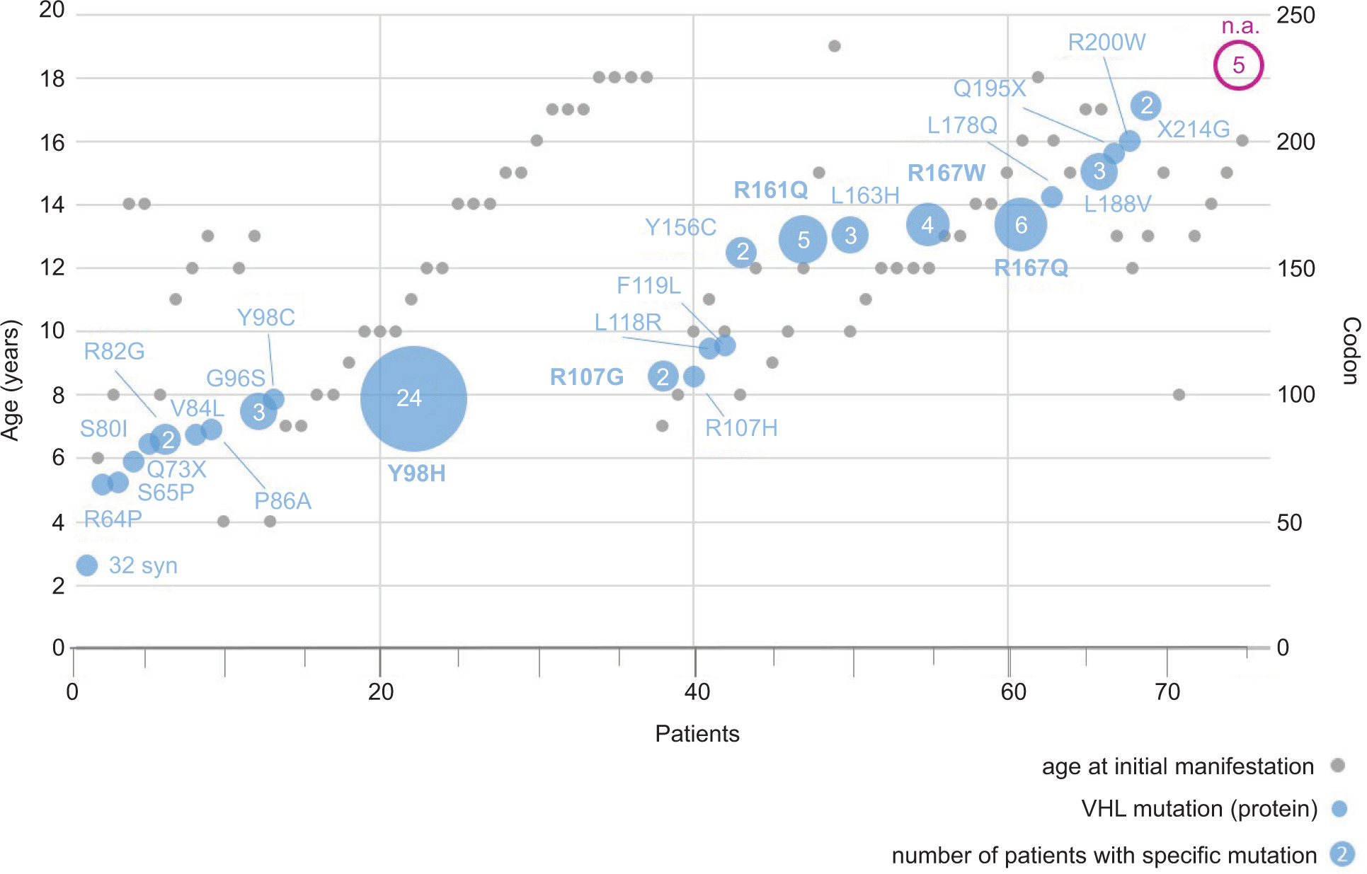 Figure 2: VHL mutations of patients with PPGL in childhood. Notes. Numbers on the X-axis: individual patients. Gray circles and Y-axis on the left: age at first PPGL manifestation. Y-axis on the right: codon numbers of VHL mutation. VHL mutations of the protein level are presented. The size of blue circles represents patient numbers with the corresponding mutation, and if >2, then the number is included. Genetic diagnosis was not available (n.a.) for five patients, but with proven VHL mutation and clinical manifestation in the family, they were not excluded from the analysis. PPGL: pheochromocytoma and paraganglioma.