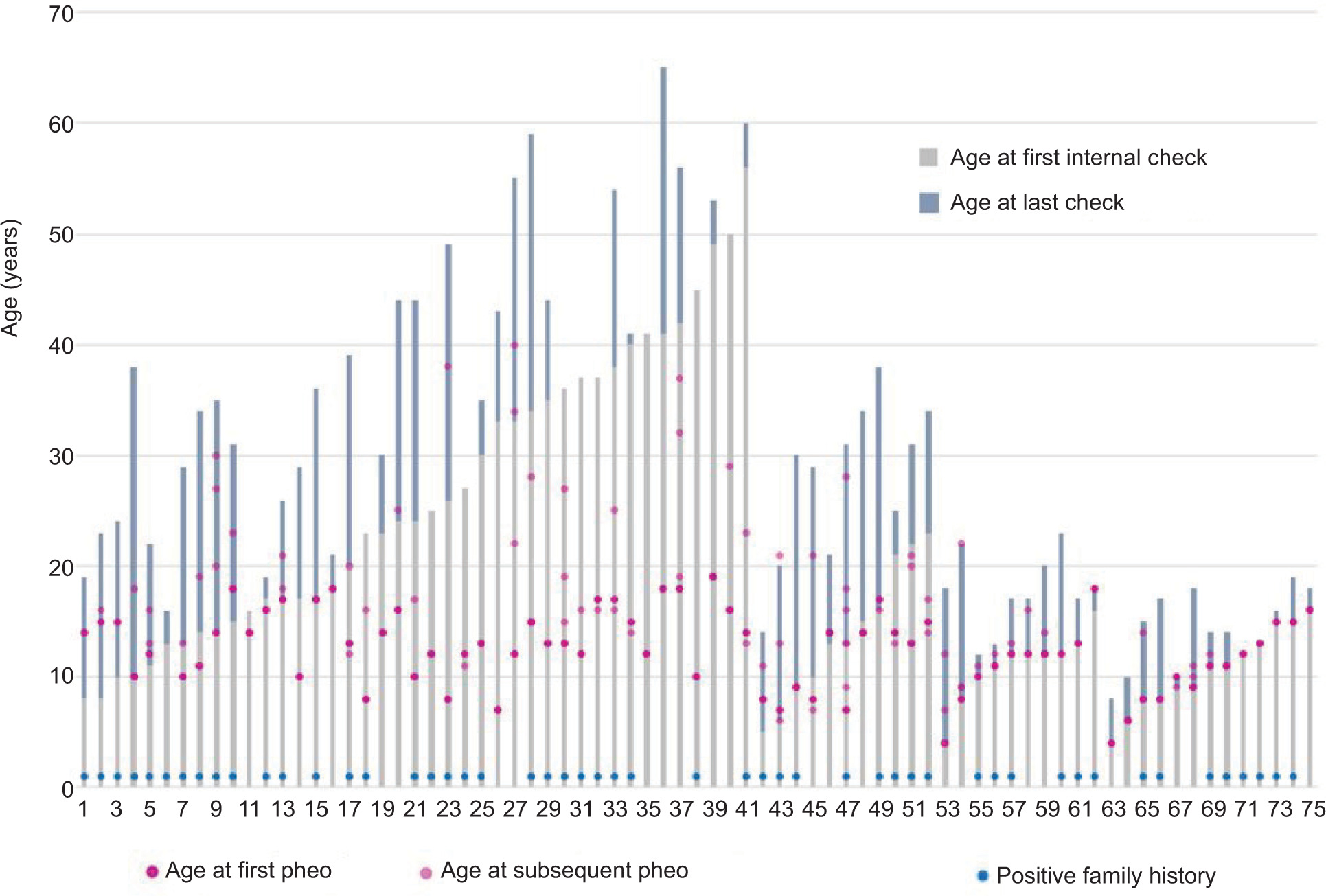 Figure 3: PPGL manifestation at baseline and during surveillance screen. Notes. Ages of patients are plotted at baseline (gray bar “first check”) and during surveillance (blue bar “difference of age at first and last check”). Circles show age of initial PPGL manifestation (pink circles) and recurrence of PPGL (“subsequent pheo”: light pink circles). Numbers on the X-axis: individual patients. Patient number 1-41, surveillance set FR-1: first visit and PPGL manifestation of patients in Freiburg as a child. Surveillance set FR-2: first visit of patients in Freiburg as adults with reported PPGL in childhood. Out of the overlap of 21 patient in both registries, for 11 patients, follow-up data (patient number 42-52, surveillance set: FR-MET) and full screening for other manifestations were available. For 10 patients, only baseline screening was available (patient number 53-62, basis set: FR-MET*). For 13 patients in the GPOH-MET (patient number 63-75, MET), only basic screening was available. PHEO: pheochromocytoma; PGL: paraganglioma; PPGL: pheochromocytoma and paraganglioma.