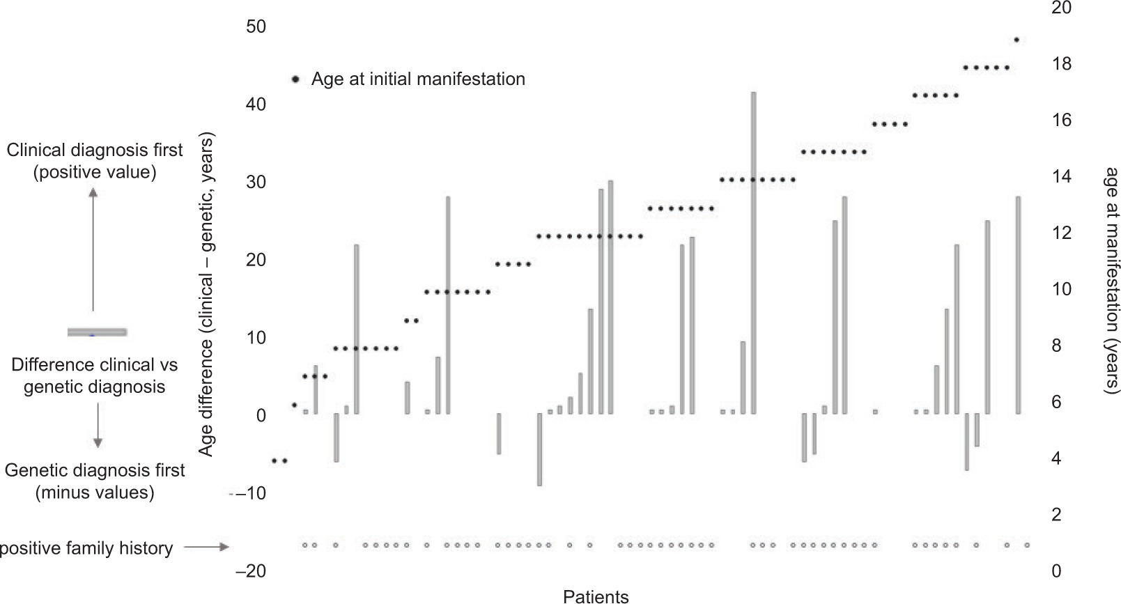 Figure 4: Timing of the genetic and clinical diagnosis. Clinical diagnosis includes first PPGL manifestation and surgery. Bar plots: time difference between clinical and genetic diagnoses (left Y-axis). Negative results represent the time course: first genetic diagnosis followed by clinical manifestation. Positive results represent the time course: first clinical manifestation followed by genetic diagnosis. For 32 patients, no data on the year of genetic testing were available.