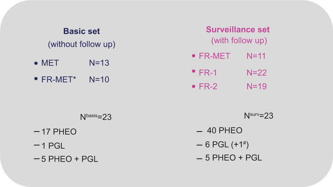 Surveillance set FR-1: first visit and PPGL manifestation of patients in Freiburg as a child. Surveillance set FR-2: first visit of patients in Freiburg as adults with reported PPGL in childhood. Out of the overlap of 21 patient in both registries, for 11 patients, follow-up data (surveillance set: FR-MET) and full screening for other manifestations were available, but for 10 patients, only baseline screening was available (basis set: FR-MET*). For 13 patients in the GPOH-MET (MET), only basic screening was available.