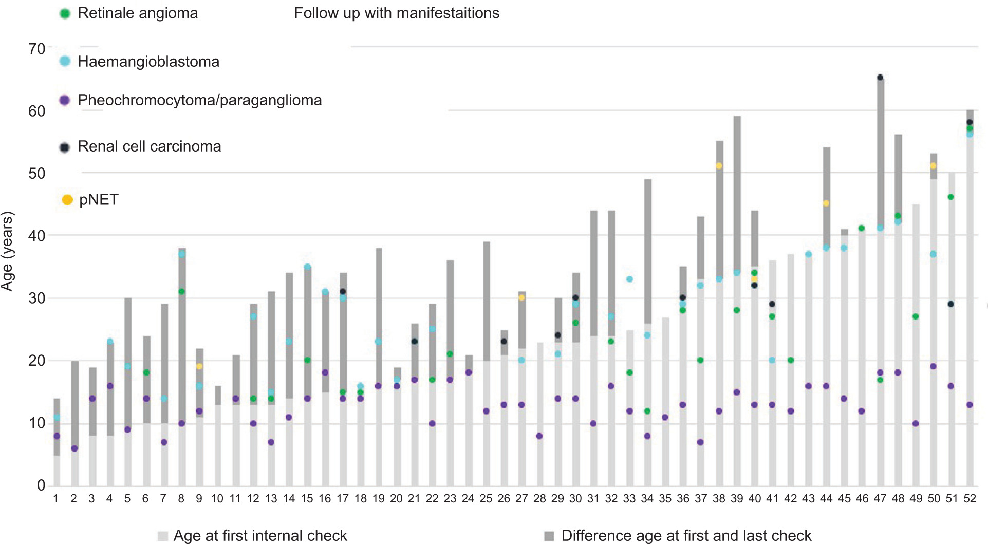 Demographic and clinical information was obtained from the registry and medical records at baseline and during follow-up. According to the current international recommendations, the Freiburg screening protocol of surveillance includes annual hormone level measurements (plasma and/or 24-h urine metanephrines), eye examination (starting at the age of 6), imaging of the abdomen and central nervous system (CNS) (starting at the age 12) usually by magnetic resonance imaging (MRI) and positron emission tomography (PET) scanning with 68Ga-peptides. PPGL was diagnosed by histology, when available, or through the combination of biochemical assays and MRI imaging. The clinical follow-up data collected in the Freiburg-VHL registry were available for 52 patients. Patients had at least two screenings at the VHL center, with on average of 1.2 screening annually. Of the 21 overlap patients of the two registries, only baseline data and no follow-up data were available for 10 Freiburg-VHL and 13 GPOH-MET patients.
