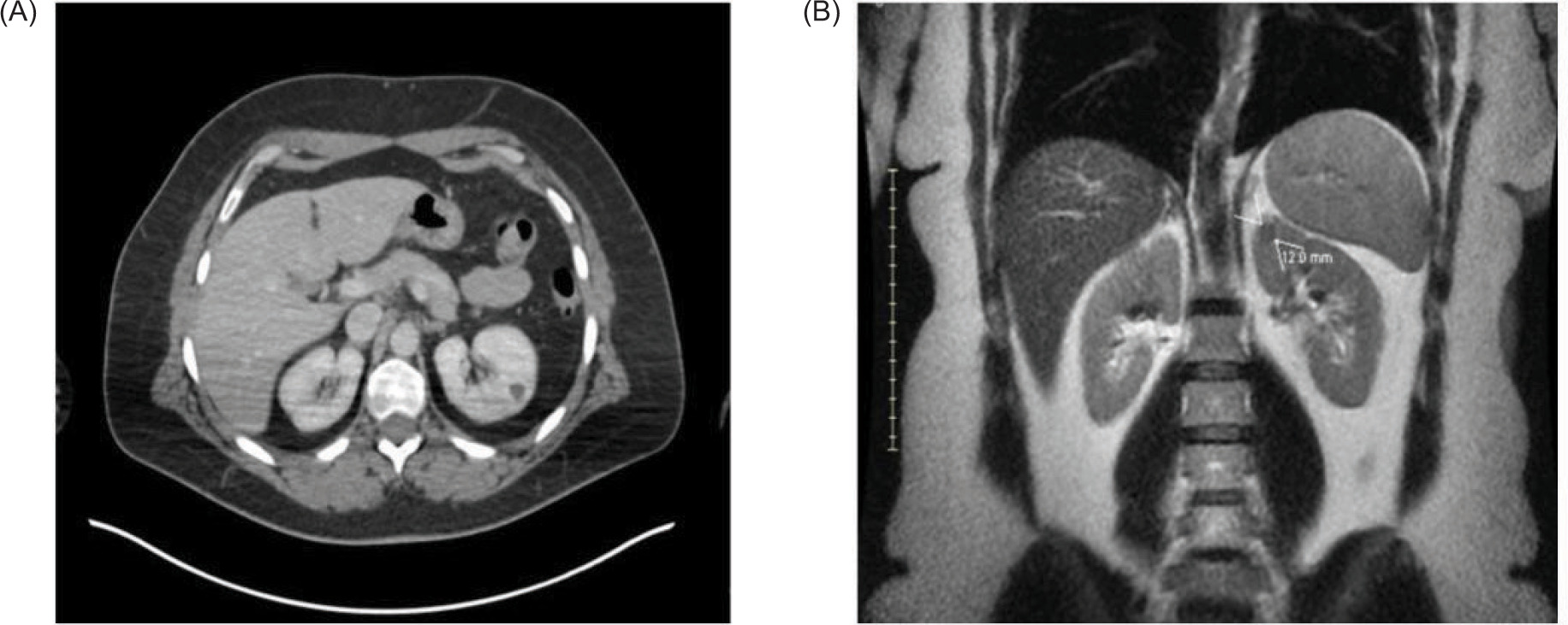 Figure 1: Small renal mass in the upper pole of the left kidney as seen on CT and MRI. (A) Axial view from CT demonstrates a 12 mm lesion. (B) Coronal view from the abdominal MRI also shows a solitary 12 mm upper pole anterior endophytic lesion of the left kidney. Pathology indicates metastatic ocular melanoma.