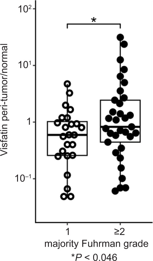 Figure 1: Ratio of visfatin mRNA expression in peritumoral to normal adipose tissue was compared between Fuhrman grade 1 and ≥2 RCC tumors. *P<0.05.
