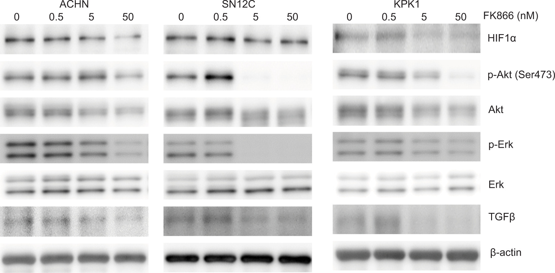 Figure 4: FK866 downregulates HIF1α, p-Akt, Akt, p-ERK, and TGFβ expressions. ACHN, SN12C, and KPK1 cells were cultured with FK866 for 48 h, and cell lysates were analyzed by western blotting with specific antibodies. β-actin was used as a loading control.