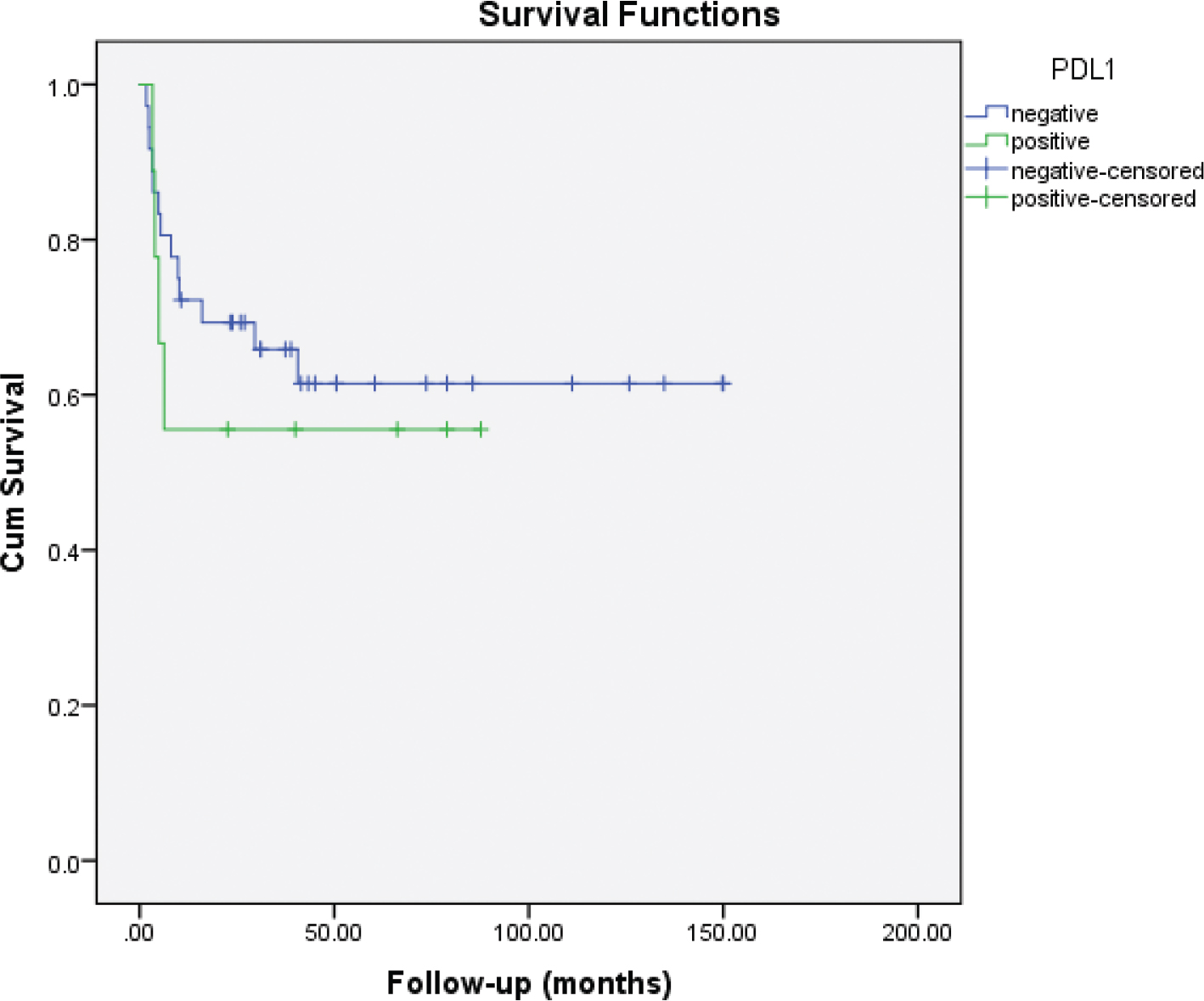 Median follow-up was 40 months (IQR: 22.9–72.5). Eleven (24.4%) patients had died of disease at the time of the analysis. Five-year CSS was 83 and 73% for PD-L1 negative and positive cases, respectively (log-rank P = 0.47) (Figure 2). Five-year RFS was 61.5 and 55.6% for PD-L1 negative and positive cases, respectively (log-rank P = 0.58) (Figure 3).