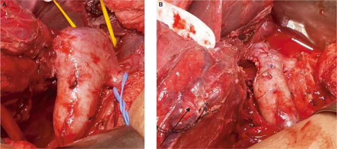 Figure 2: (A) Level 2 thrombus with proximal, distal and left renal tourniquet. (B) Completion of tumor thrombectomy with renal mass (arrow) in situ.