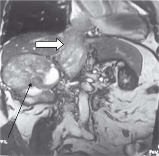 Figure 3: Level 4 thrombus with arrow (Black) showing mass in right kidney and white arrow thrombus in IVC extending to right atrium.