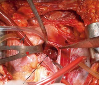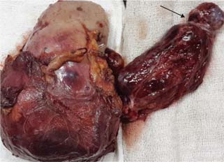Figure 5: Completion of nephrectomy with tumor thrombus level 4 with arrow showing thrombus removed from atrium and IVC.