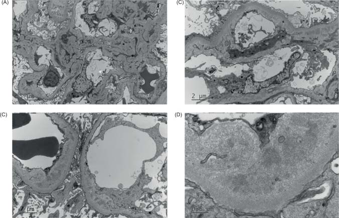 Figure 2: Electron micrographs of kidney transplant biopsy. (A) Mesangial expansion by increased mesangiocytic processes and electron dense deposits. (B and C) Subendothelial lucent widening with loss of endothelial fenestrations, mesangial interpositioning, and intramembranous electron-dense deposits. (D) Higher power view of deposits showing vaguely fibrillary substructure.