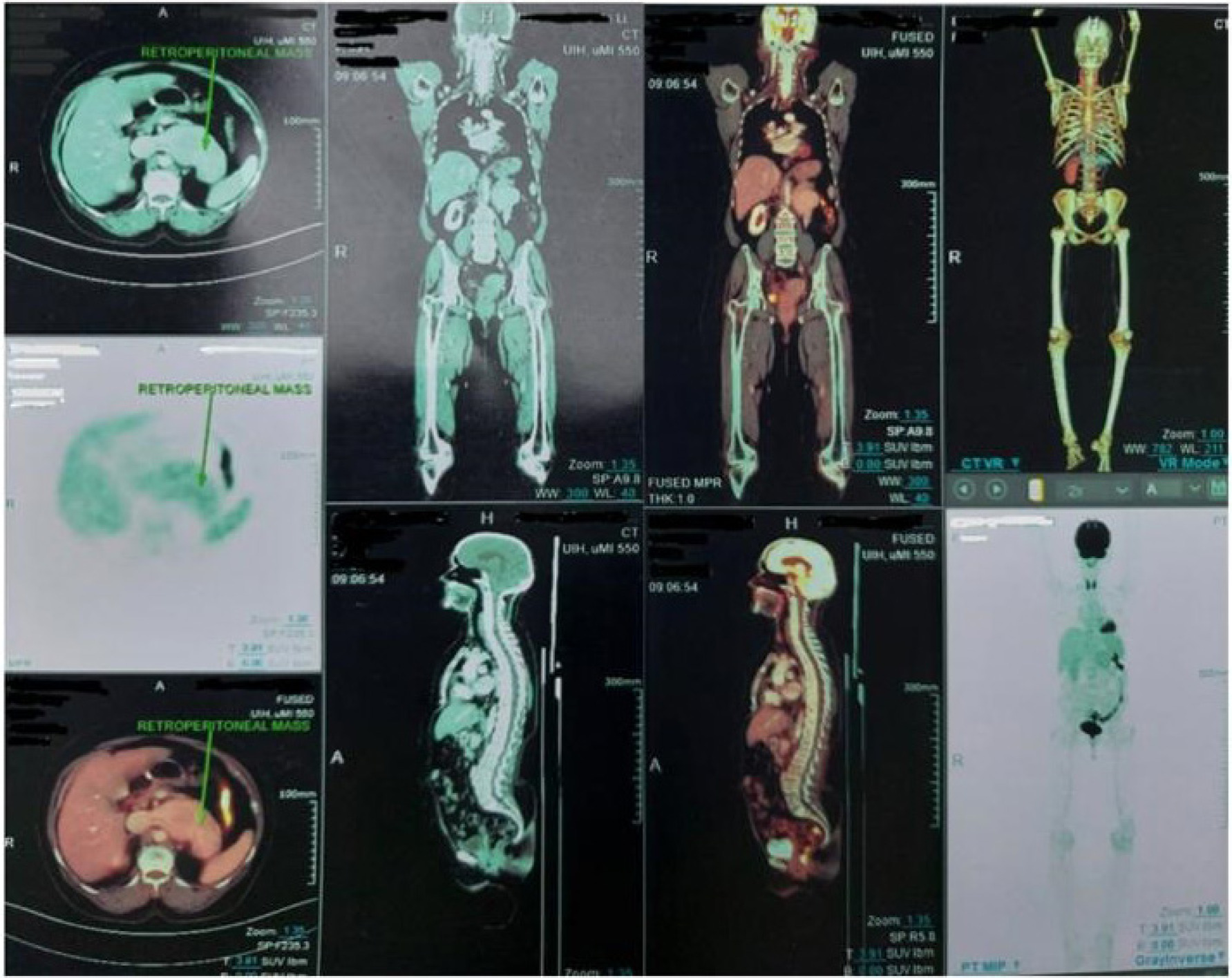 A PET scan was conducted to assess the metabolic activity of the lesion, which showed a hypermetabolic, lobulated mass infiltrating the IVC, along with an FDG-avid enlarged right supraclavicular lymph node. The findings were consistent with metastatic RCC. The PET scan also confirmed the presence of the hypermetabolic mass in the retroperitoneal area, confirming the suspicion of recurrent disease (Figure 4).