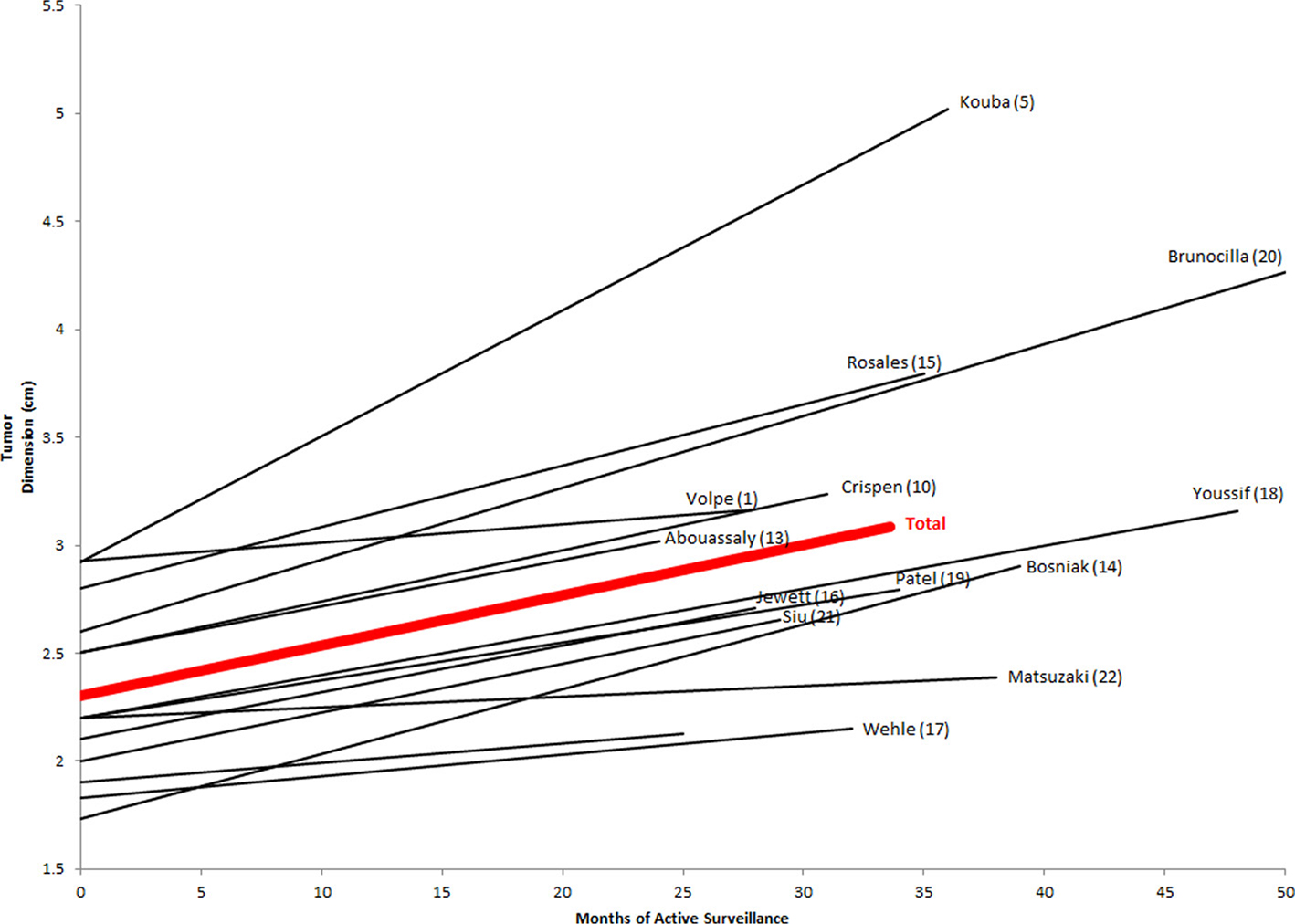 We performed a literature search of English-language publications in the MEDLINE database to identify clinical studies that reported AS of clinically localized SRMs from 1995 to 2016 using the National Center for Biotechnology Information’s PubMed site. Studies on SRMs that were clinically localized at initial presentation were included. Series that included metastatic RCC and those that did not differentiate the growth rates of localized versus metastatic disease were excluded from our study. Studies analyzing duplicate or previously studied populations were excluded. Furthermore, case reports on the observation or treatment of single lesions were excluded from analysis.