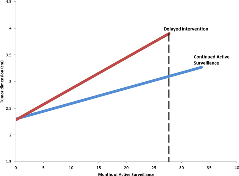 Figure 3. Tumor dimension versus time on active surveillance for patients undergoing delayed intervention versus those on active surveillance. Line slopes represent mean growth rate in each series. Dashed line represents mean surveillance time.
